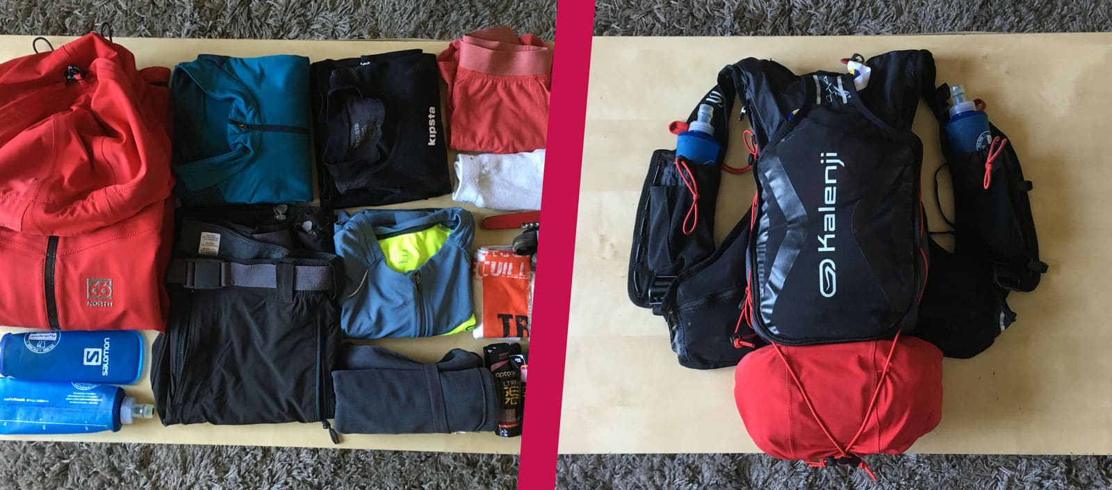 Etant donné que l’objectif de ce séjour trail et de pouvoir en profiter pour courir la majorité des sentiers de randonnée, j’ai sélectionné des itinéraires sur lesquels nous aurons de quoi nous ravitailler chaque jour. J’ai décidé de partir avec un paquetage minimaliste. Il a fallu que j’arrive a faire tenir dans mon sac de trail le nécessaire pour supporter l’ensemble des conditions climatiques au cours du plus long périple à savoir 55km en 2 jours avec une nuit à 3000m.